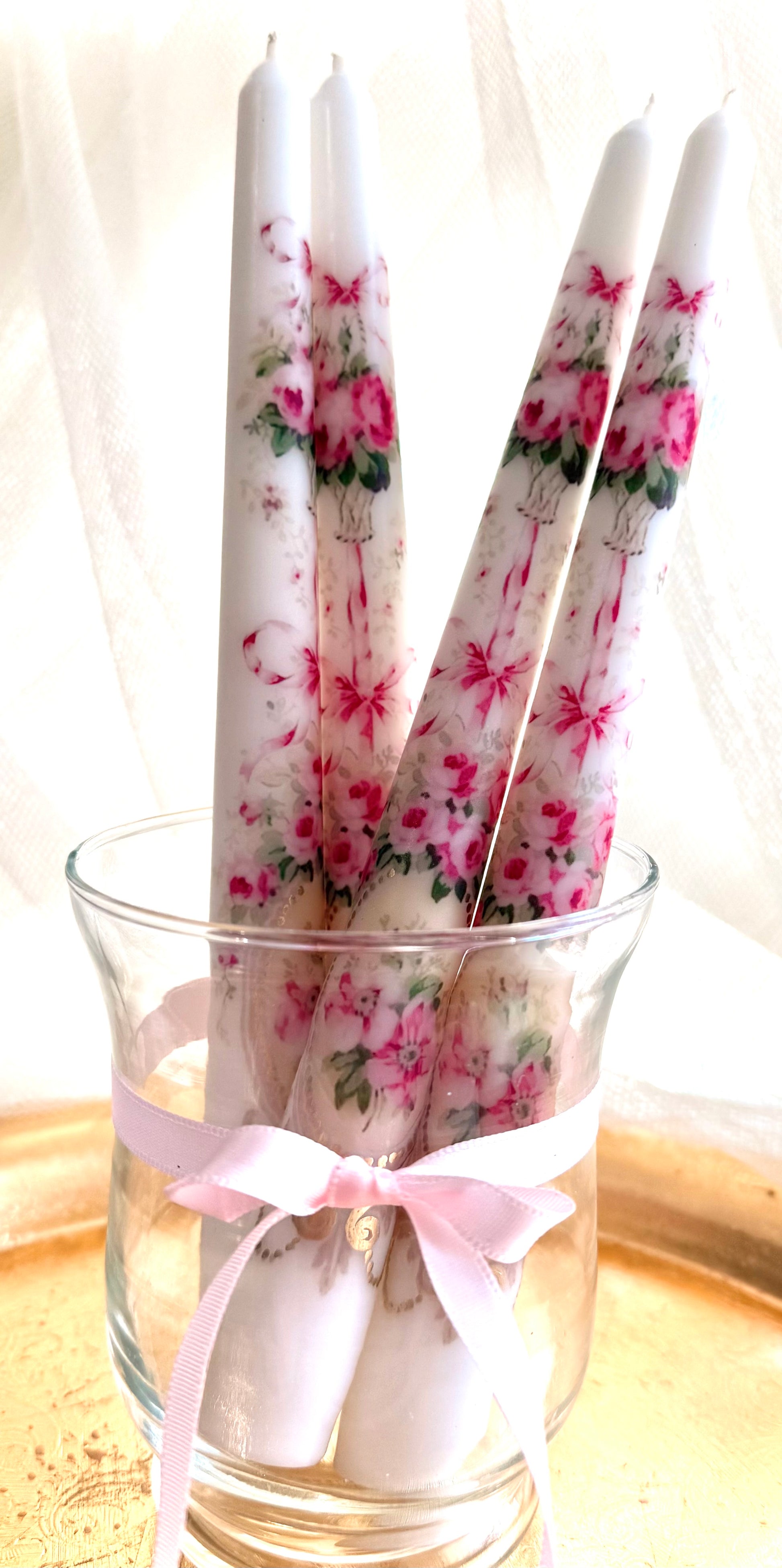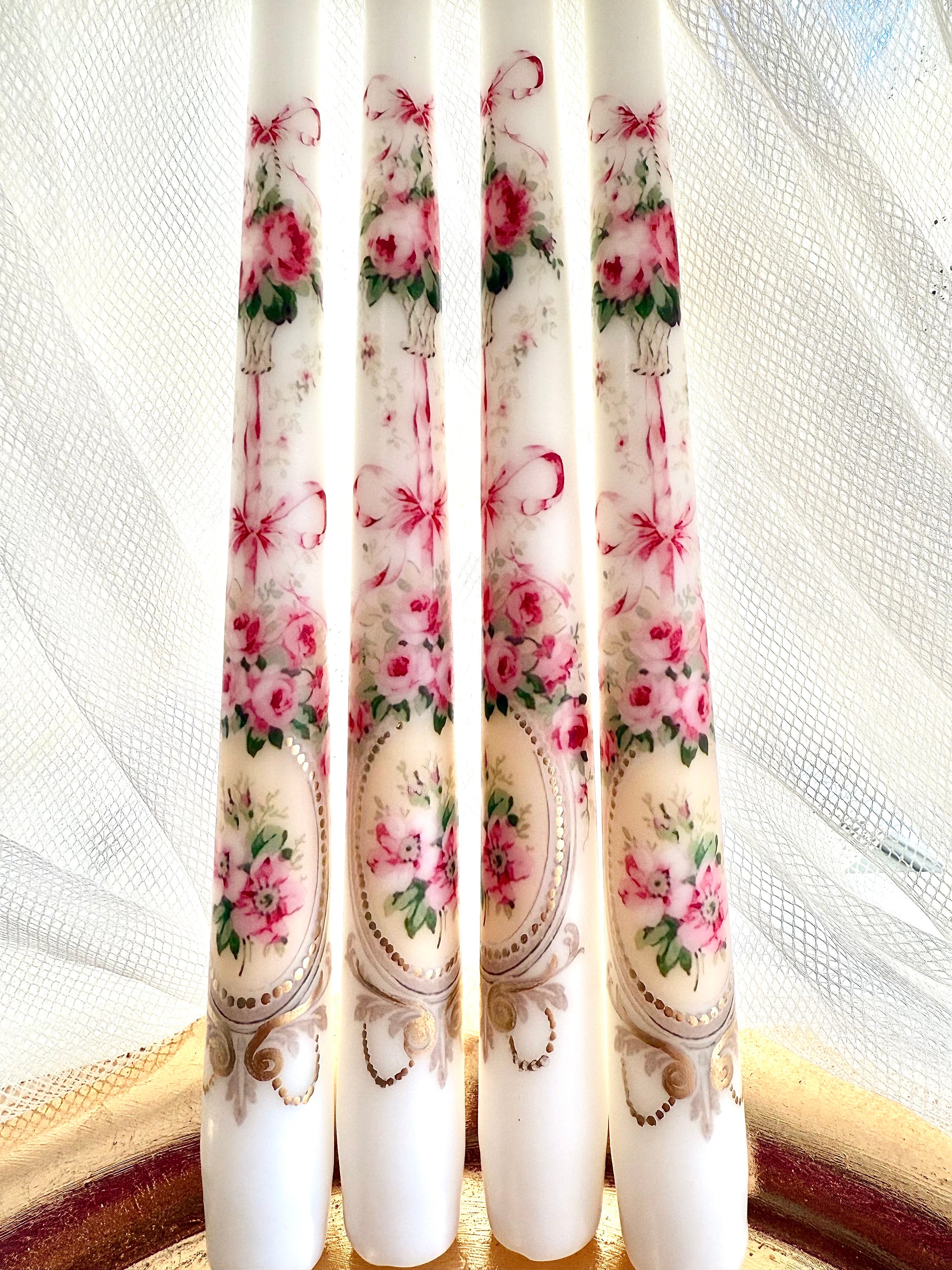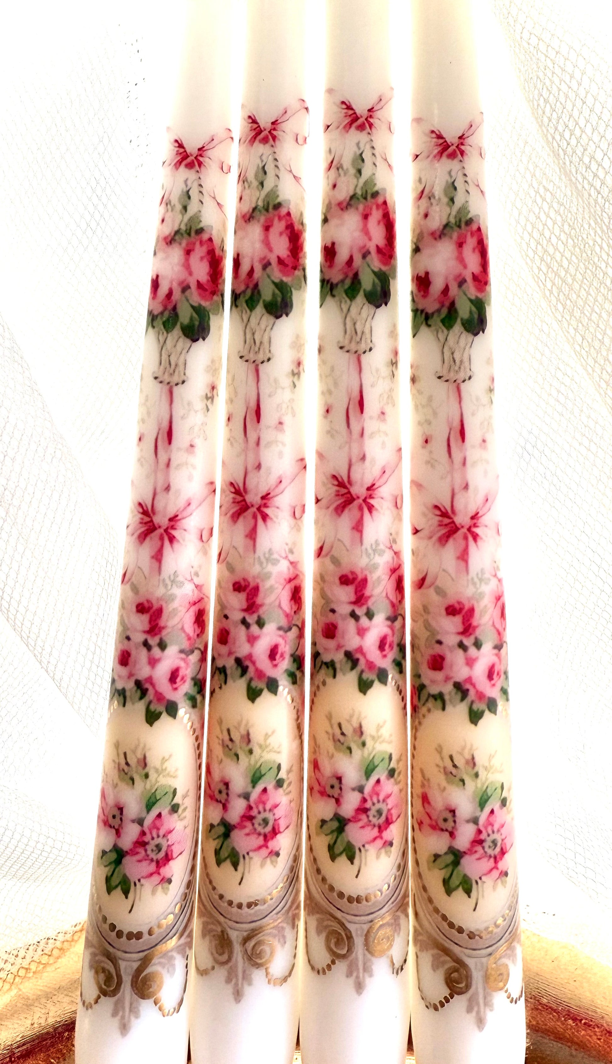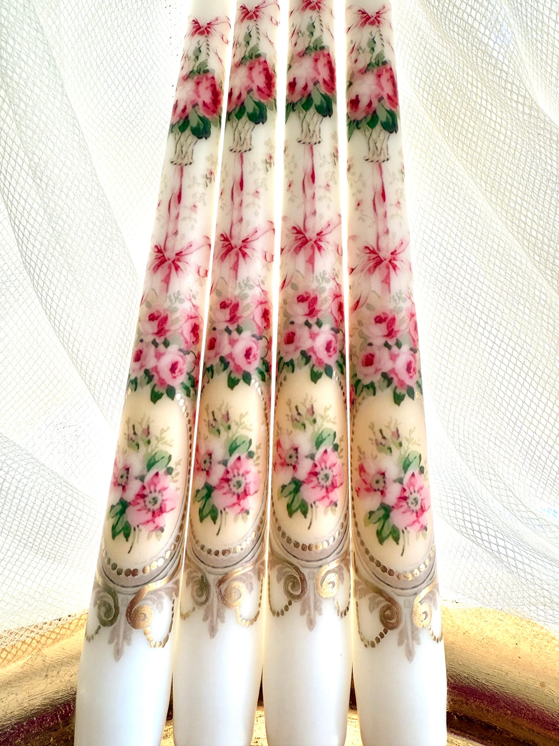 10 in. Tapered candles with pink floral design and gold embellishments. Set of two