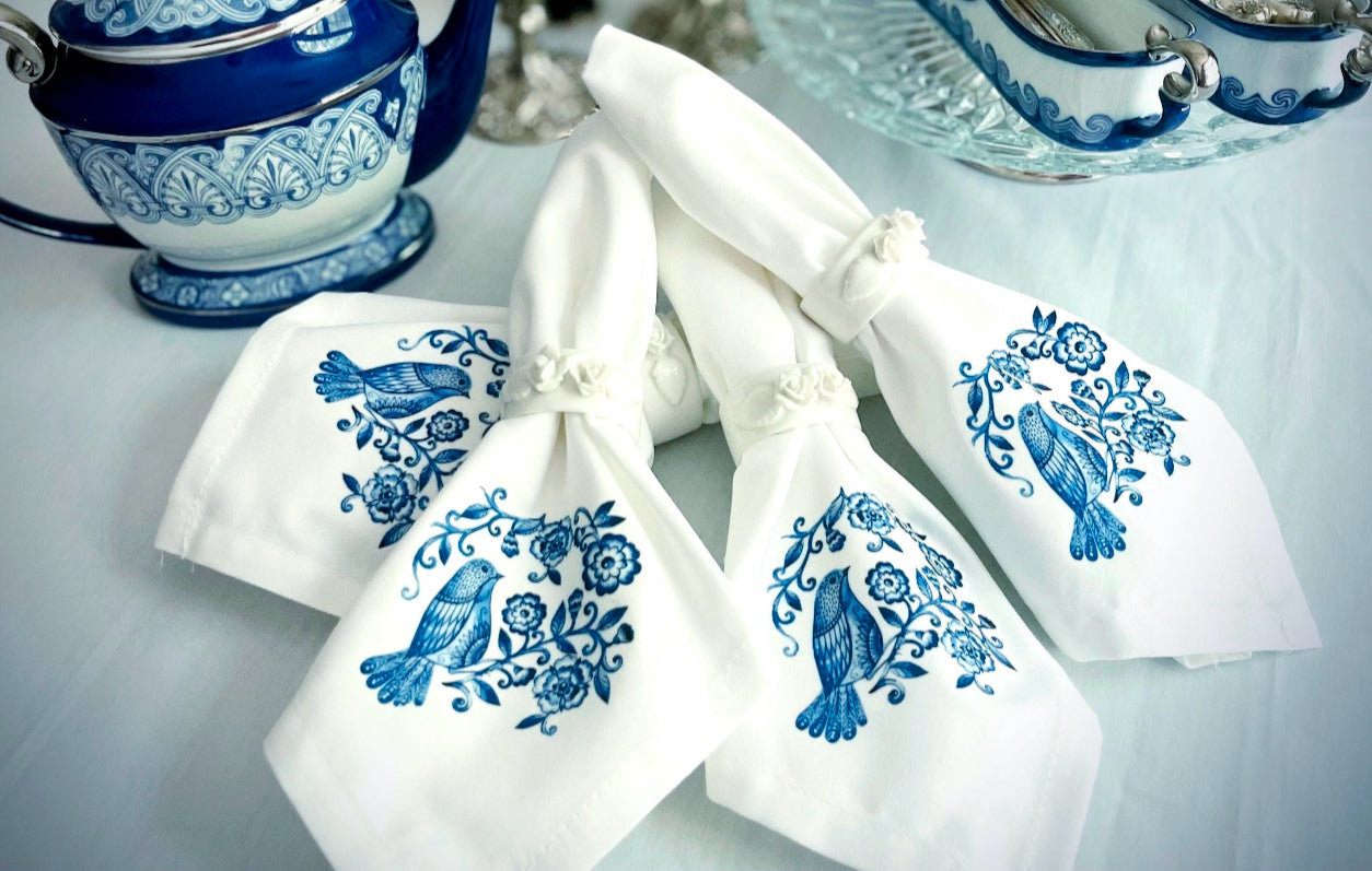 Set of four 18x18 in. Cotton blend cloth napkins with blue bird chinoiserie design